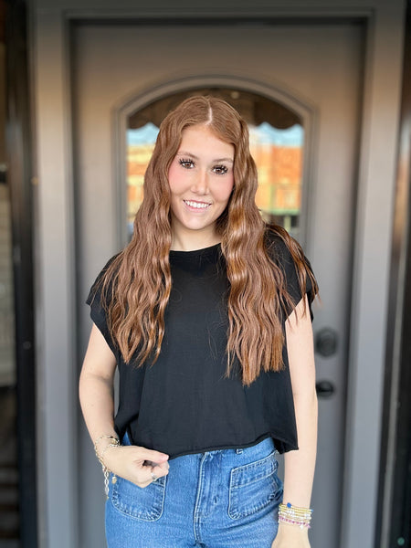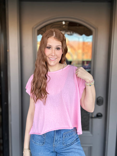 A casual boxy tee with a crew neckline, relaxed sleeves, and open back.