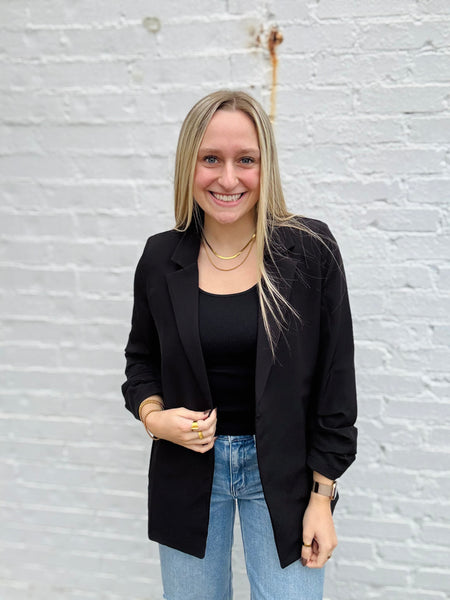 3/4 Ruched Sleeve Blazer with Pockets and Shoulder Pads