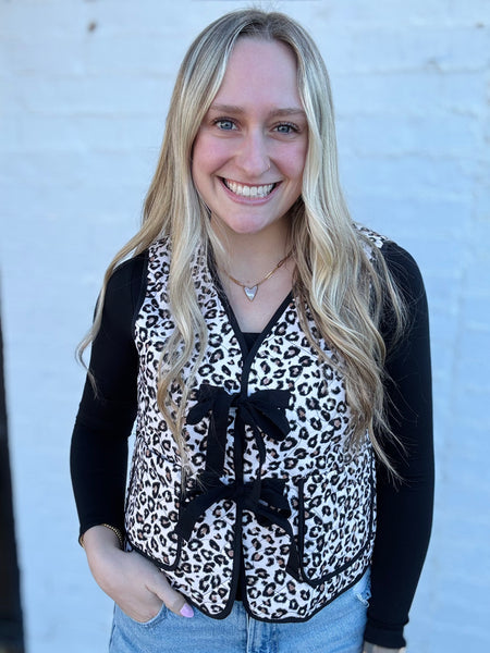 Leopard Print Quilted Vest with Bow Tie Detail