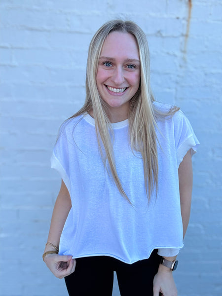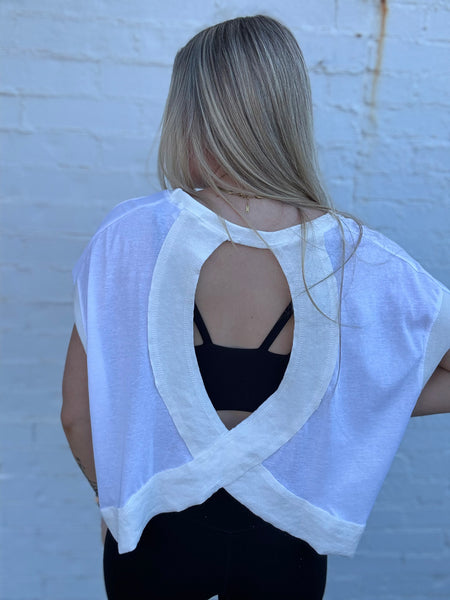 A casual boxy tee with a crew neckline, relaxed sleeves, and open back.